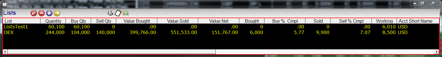 List Items are the individual orders that make up a list. Here is an example of list items with entries from 2 different lists. These are entries in the list and not orders in the marketplace. Tradable orders can be entered from this window either in groups called slices, or individually via the order ticket.