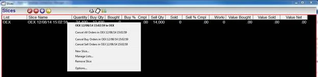 The right mouse menu in this panel allows the trader to perform actions within the current slice, and on orders for the current slice Item.